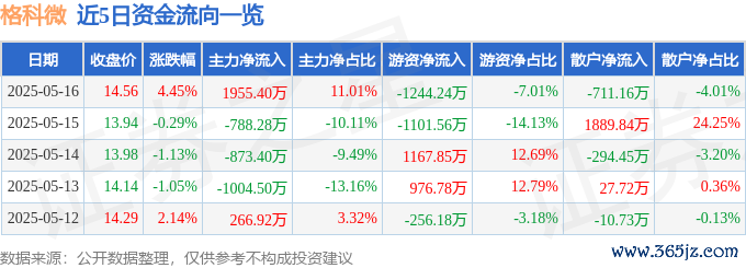 5月16日的资金流向数据方面,主力资金净流入1955.4万元,占总成交额11.01%,游资资金净流出1244.24万元,占总成交额7.01%,散户资金净流出711.16万元,占总成交额4.01%。