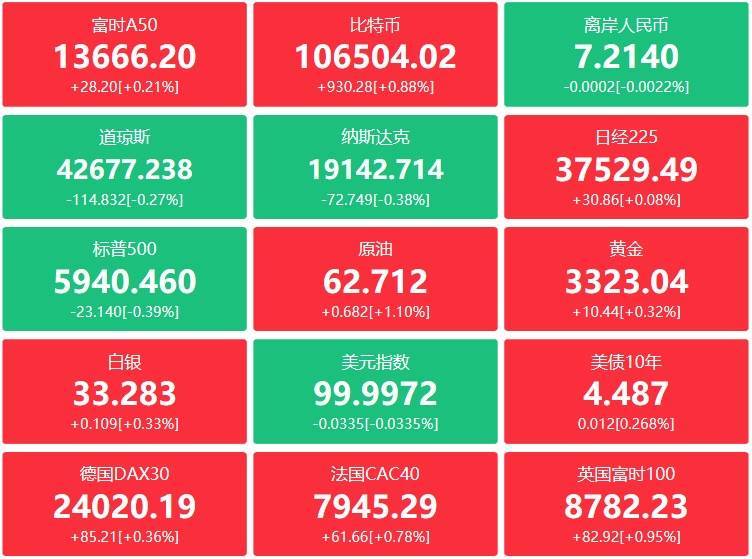 外盘:市场继续关注美股财报与国际贸易局势,美股震荡收跌,道指跌114.83点,跌幅0.27%报42677.24点;纳指跌72.75点,跌幅0.38%报19142.71点;标普500跌23.14点,跌幅0.39%报5940.46点;大型科技股多数下跌,亚马逊、谷歌跌超1%。挪威邮轮、爱彼迎跌超3%。贵金属板块走高,Vista黄金涨近18%,科尔黛伦矿业涨超5%,哈莫尼黄金涨超4%;中概股多数收跌,纳斯达克中国金龙指数跌0.65%,携程网跌超5%,蔚来跌近2%,爱奇艺、小鹏汽车跌超1%,阿里巴巴涨超1%。